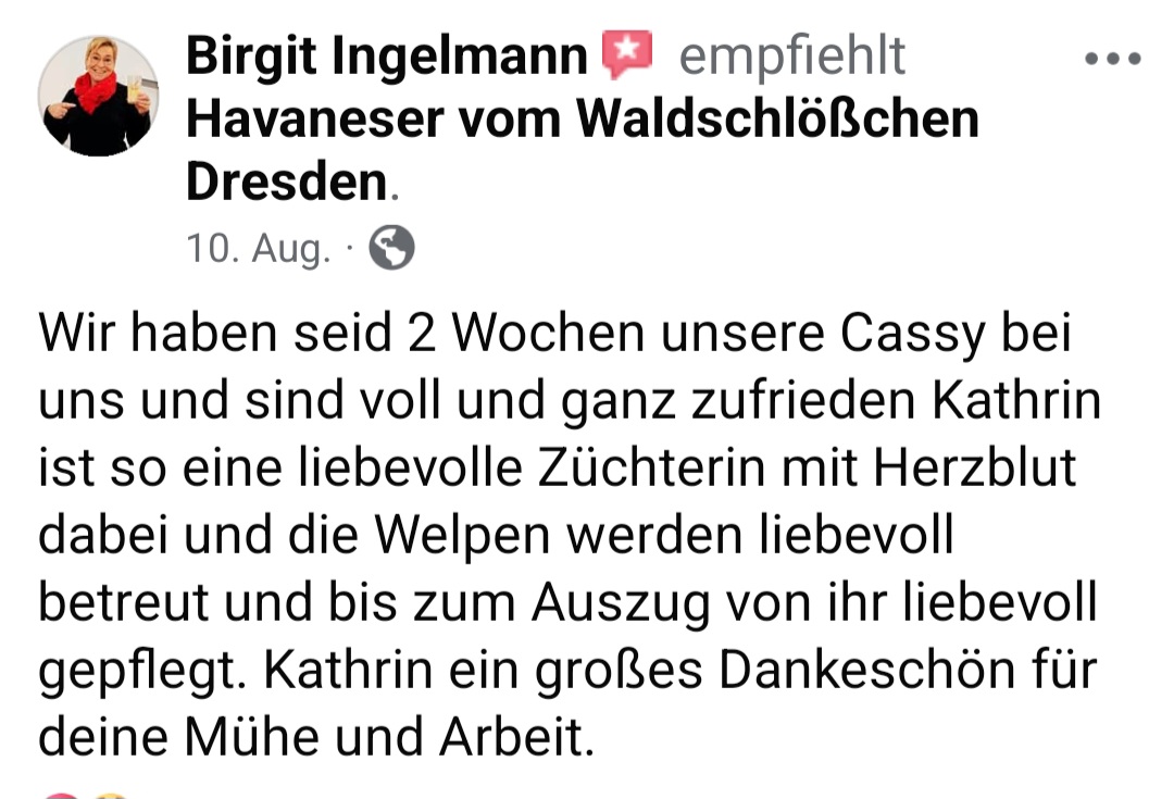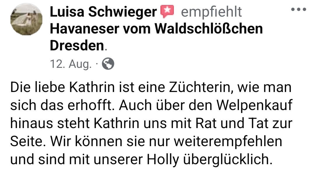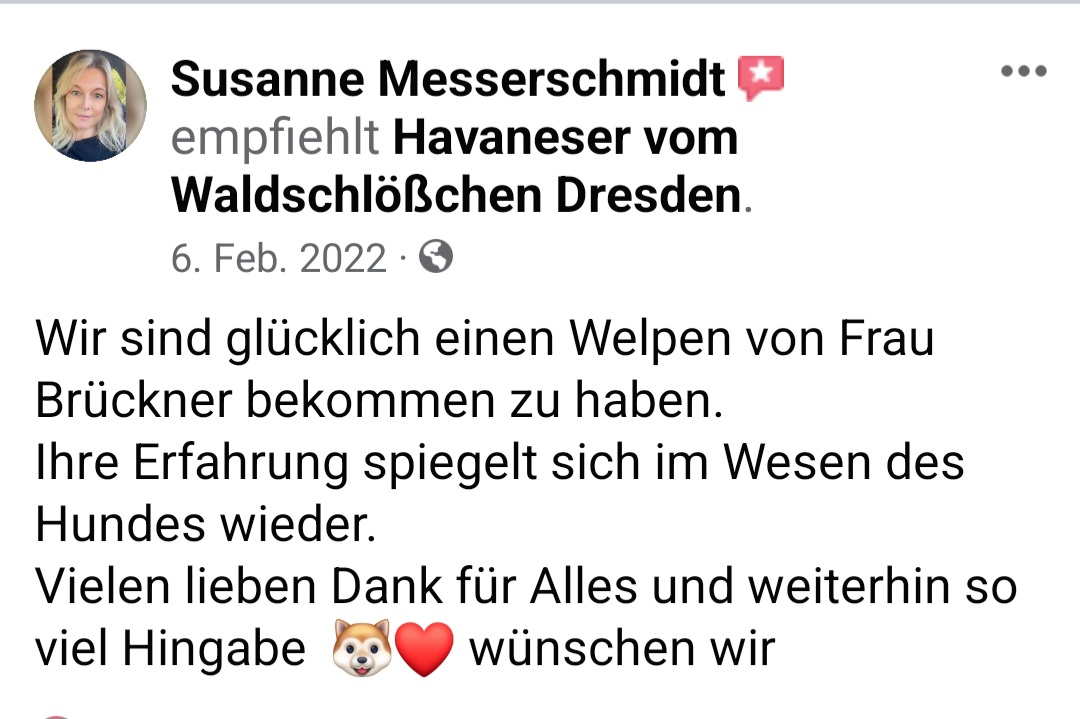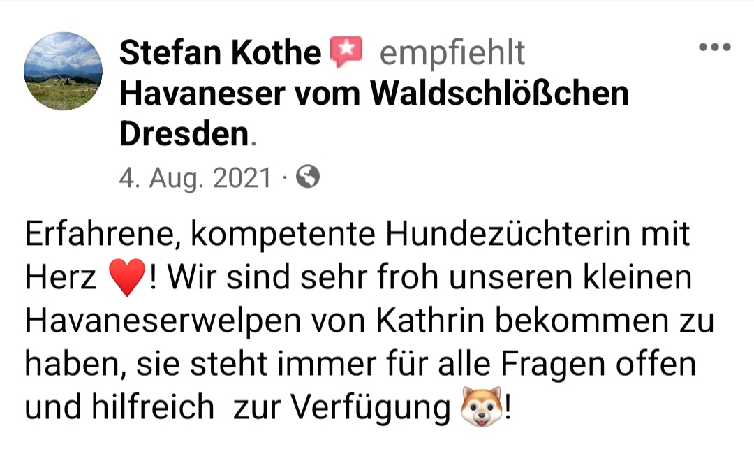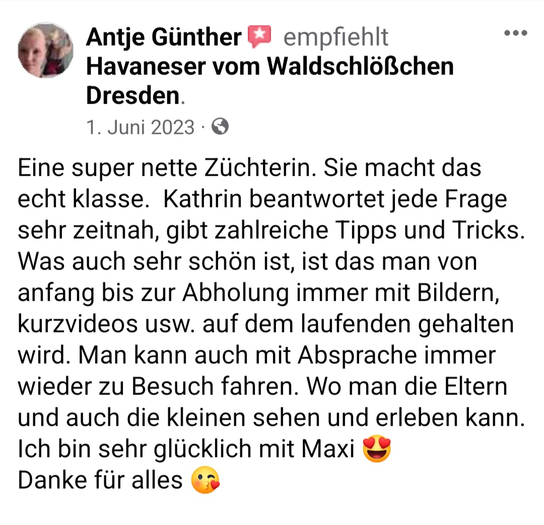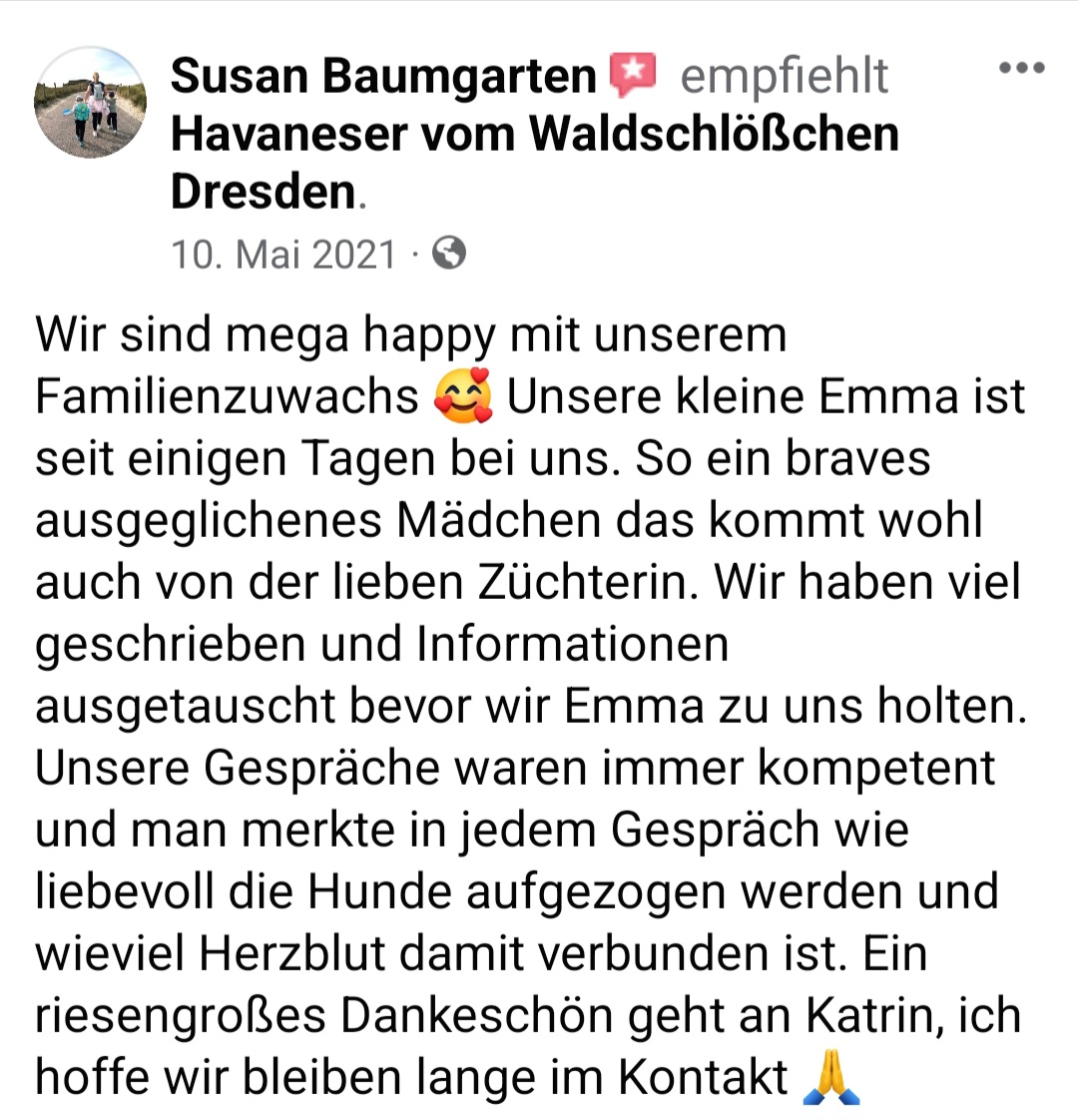 Die Zwinger "vom Waldschlösschen und "vom Röderland" sind eine erstklassige Adresse für liebevoll aufgezogene Havaneser Rassehunde. Hier ist man als Kunde in den allerbesten Händen wenn man so einen kleinen Niedling zu sich in die Familie holen möchte. Die süssen Welpen werden online ausführlich vorgestellt und man bekommt bereits ein gutes Gefühl für den Stammbaum und auch die Züchterin. Hat man sich per Vertrag für ein neues Familienmitglied entschieden darf man jede Menge Vorfreude genießen. Man wird als künftiger Halter in einen Freundeskreis Gleichgesinnter aufgenommen und in den Wochen vor der Übernahme mit ganz vielen schönen Details über das Aufwachsen der kleinen Racker beglückt. Von Chatgruppen mit Foto- und Videomaterial, Gruppenanrufen, Audiobotschaften, Wachstumstabellen und auch direkten Kennenlernbesuchen ist alles dabei. Dabei werden viele Tipps und Kniffe für die spätere Eingewöhnungsphase und das Heranwachsten ausgetauscht und auch Sorgen besprochen und zerstreut. Die Züchterin steckt extrem viel Liebe in Details die den kleinen Neuankömmlingen das Ankommen in ihren jeweiligen Familien erleichtern. Man kommt als Kunde und geht als Freund. Absolute Empfehlung und großes Kompliment für diese Leistung.