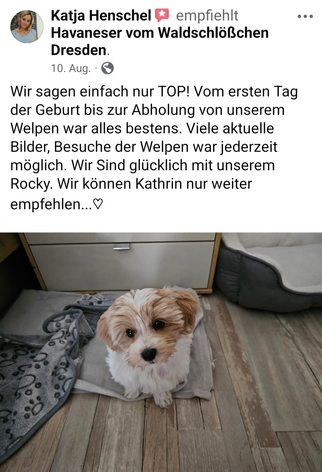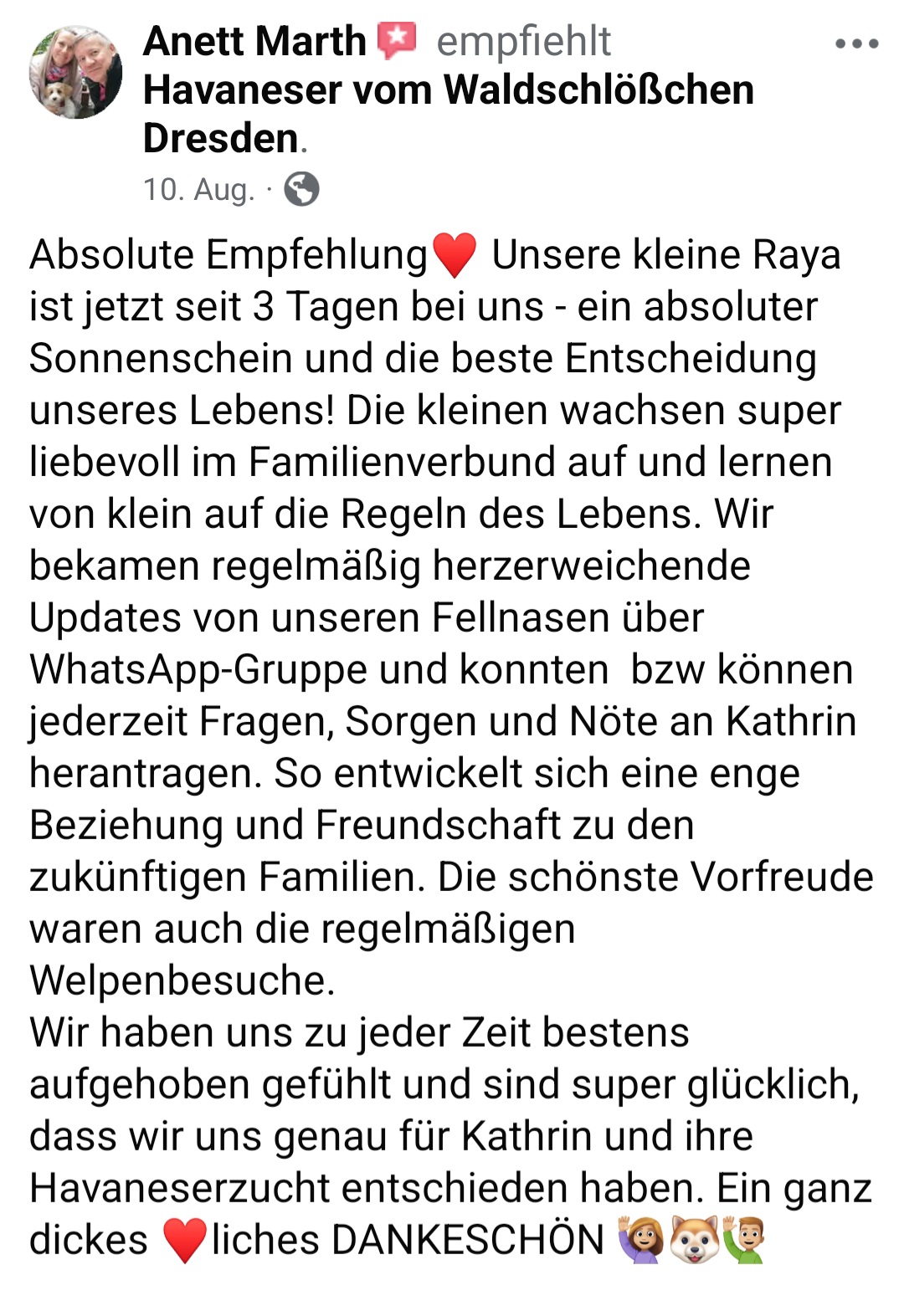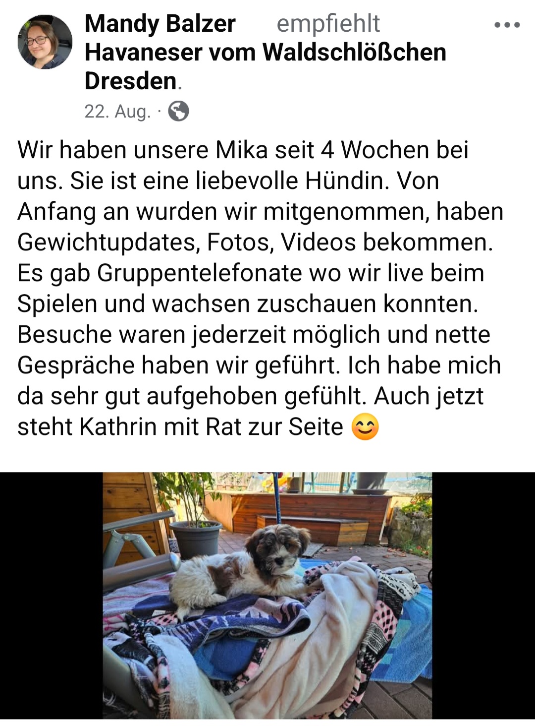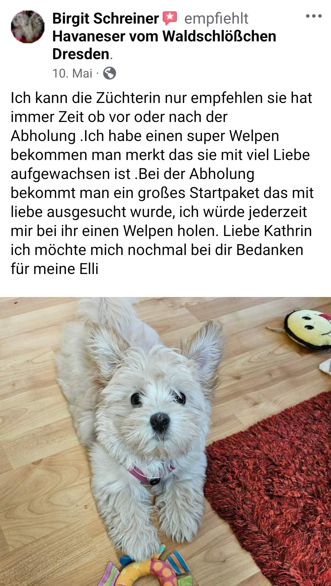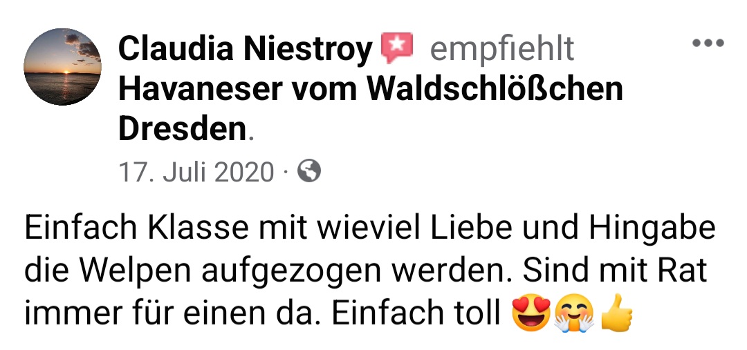 Die Zwinger "vom Waldschlösschen und "vom Röderland" sind eine erstklassige Adresse für liebevoll aufgezogene Havaneser Rassehunde. Hier ist man als Kunde in den allerbesten Händen wenn man so einen kleinen Niedling zu sich in die Familie holen möchte. Die süssen Welpen werden online ausführlich vorgestellt und man bekommt bereits ein gutes Gefühl für den Stammbaum und auch die Züchterin. Hat man sich per Vertrag für ein neues Familienmitglied entschieden darf man jede Menge Vorfreude genießen. Man wird als künftiger Halter in einen Freundeskreis Gleichgesinnter aufgenommen und in den Wochen vor der Übernahme mit ganz vielen schönen Details über das Aufwachsen der kleinen Racker beglückt. Von Chatgruppen mit Foto- und Videomaterial, Gruppenanrufen, Audiobotschaften, Wachstumstabellen und auch direkten Kennenlernbesuchen ist alles dabei. Dabei werden viele Tipps und Kniffe für die spätere Eingewöhnungsphase und das Heranwachsten ausgetauscht und auch Sorgen besprochen und zerstreut. Die Züchterin steckt extrem viel Liebe in Details die den kleinen Neuankömmlingen das Ankommen in ihren jeweiligen Familien erleichtern. Man kommt als Kunde und geht als Freund. Absolute Empfehlung und großes Kompliment für diese Leistung.