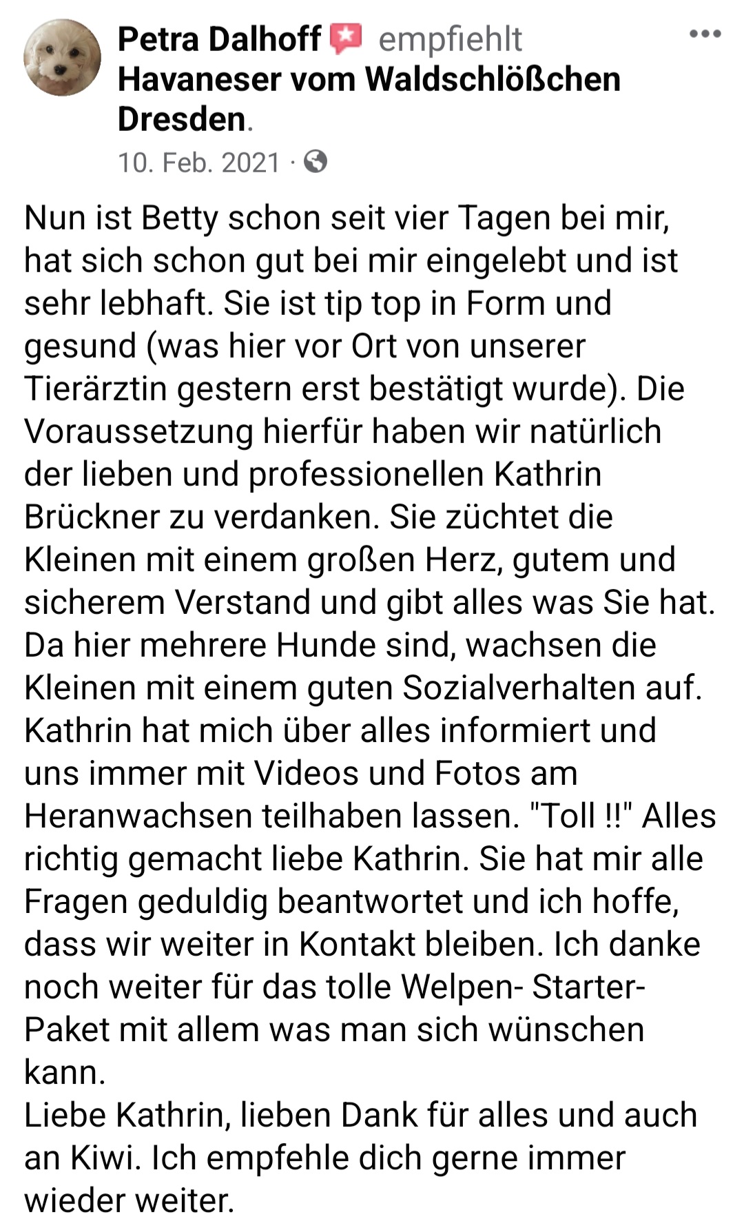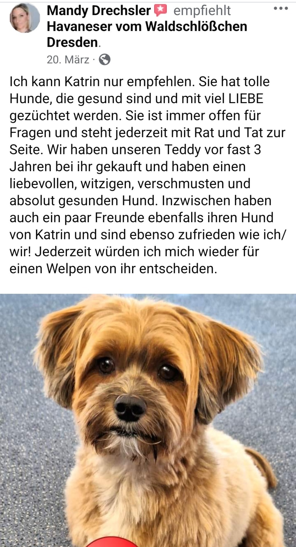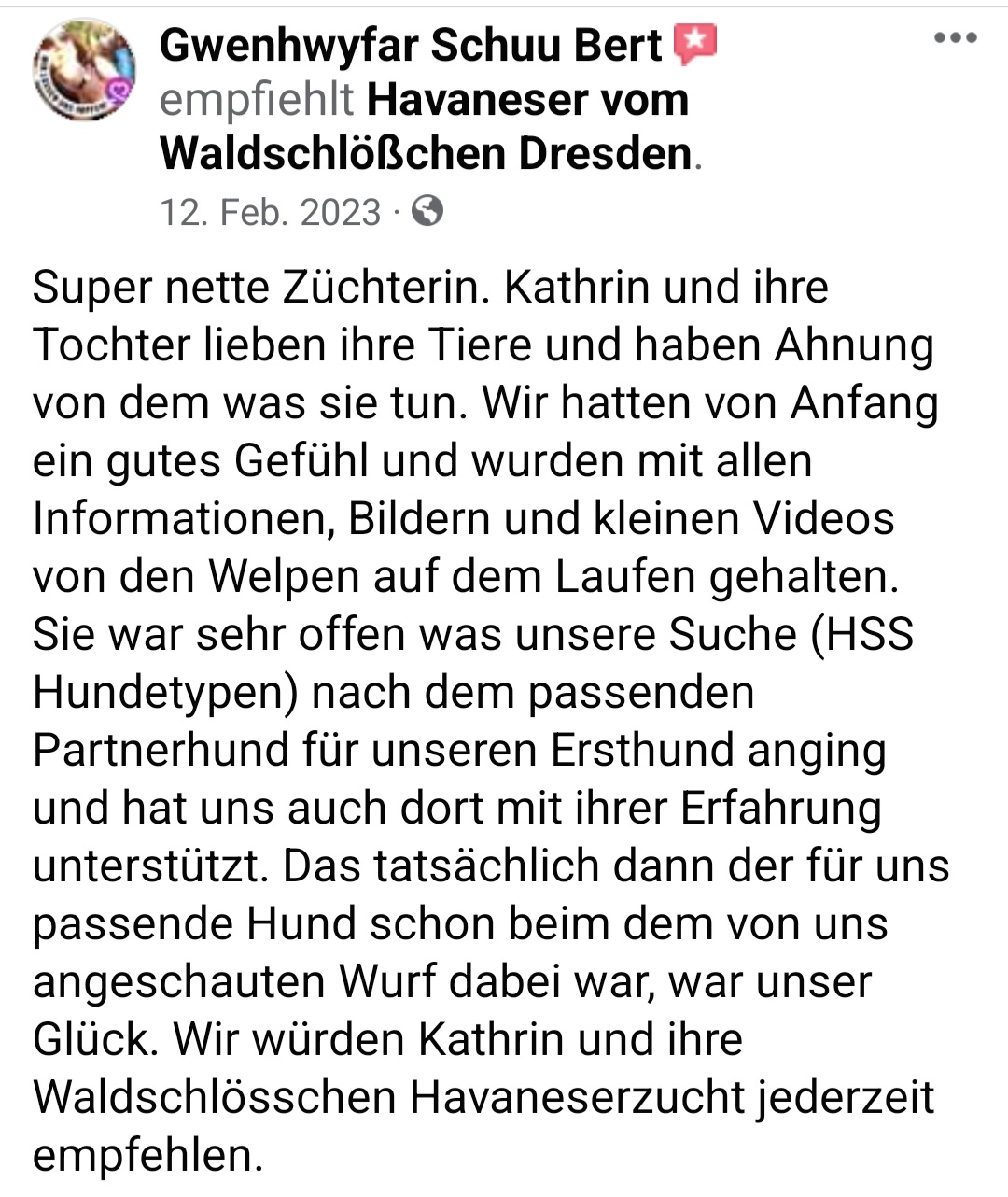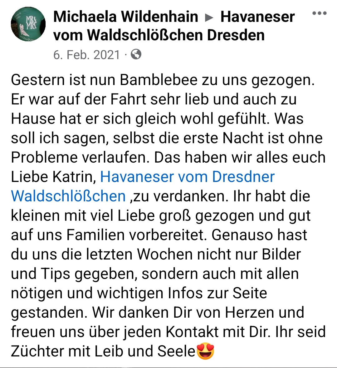 Die Zwinger "vom Waldschlösschen und "vom Röderland" sind eine erstklassige Adresse für liebevoll aufgezogene Havaneser Rassehunde. Hier ist man als Kunde in den allerbesten Händen wenn man so einen kleinen Niedling zu sich in die Familie holen möchte. Die süssen Welpen werden online ausführlich vorgestellt und man bekommt bereits ein gutes Gefühl für den Stammbaum und auch die Züchterin. Hat man sich per Vertrag für ein neues Familienmitglied entschieden darf man jede Menge Vorfreude genießen. Man wird als künftiger Halter in einen Freundeskreis Gleichgesinnter aufgenommen und in den Wochen vor der Übernahme mit ganz vielen schönen Details über das Aufwachsen der kleinen Racker beglückt. Von Chatgruppen mit Foto- und Videomaterial, Gruppenanrufen, Audiobotschaften, Wachstumstabellen und auch direkten Kennenlernbesuchen ist alles dabei. Dabei werden viele Tipps und Kniffe für die spätere Eingewöhnungsphase und das Heranwachsten ausgetauscht und auch Sorgen besprochen und zerstreut. Die Züchterin steckt extrem viel Liebe in Details die den kleinen Neuankömmlingen das Ankommen in ihren jeweiligen Familien erleichtern. Man kommt als Kunde und geht als Freund. Absolute Empfehlung und großes Kompliment für diese Leistung.